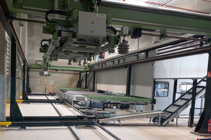 For effective and efficient feeding, Systraplan has implemented a line gantry as well as an area gantry with two manipulators and axis-dependent speeds of 50 to 150 m/min. This enables material preparation and alignment of the panels within 30 to 60 seconds of request.