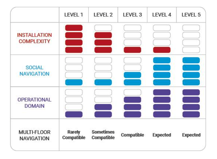 Level 5 robots are robots that could navigate in all indoor environments on par with human skill, as well as do so in a completely new environment without detailed prebuilt maps and a manually intensive installation process.