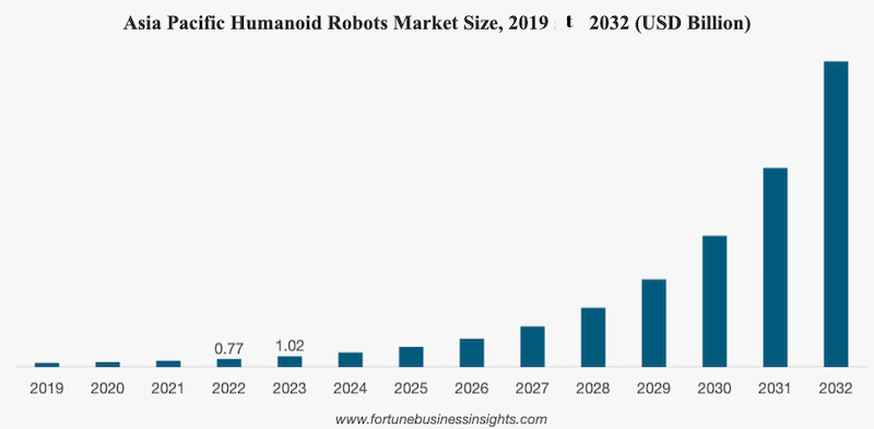 The global humanoid robot market is set for significant growth in the Asia-Pacific market at least, according to Fortune Business Insights. Valued at approximately $2.43 billion in 2023, it is projected to reach $66 billion by 2032, exhibiting a compound annual growth rate of 45.5 per cent during the forecast period.